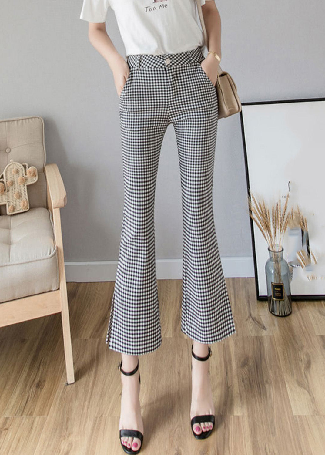 Women Black White Plaid High Waist Side Open Button Crop Pants Spring LY0169