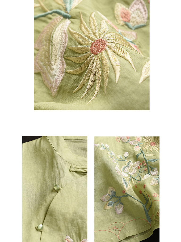 Indulge in sophistication with our Women Vintage Floral Embroidery Ramie Stand Collar Shirt WE1038. Crafted from premium ramie fabric, this shirt boasts a stunning floral embroidery design. The refined stand collar, half sleeves, and raglan sleeve style elevate this artsy piece to a whole new level. Ideal for the warmer seasons, this shirt is a must-have for the style-conscious.